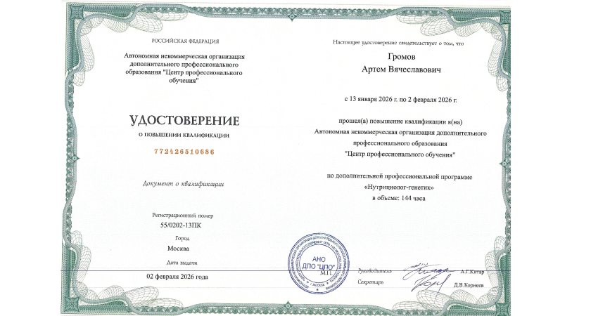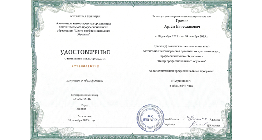 Громов Артём Вячеславович — врач-нутрициолог и специалист по спортивному питанию с акцентом на генетику. Помогает достигать целей в похудении, наборе мышечной массы и подготовке к спортивным соревнованиям. Создаёт индивидуальные программы питания с учётом генетических особенностей, сопровождает пациентов очно и онлайн, включая подготовку к фитнес-бикини и целевое моделирование фигуры.