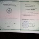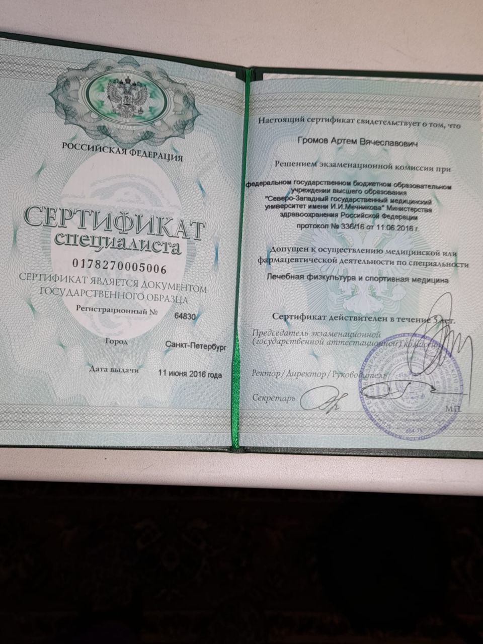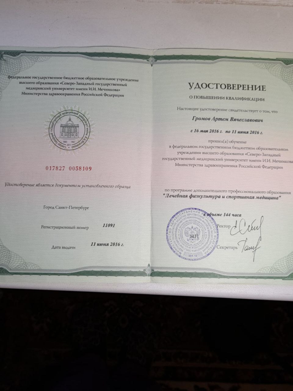- Санкт-Петербургский государственный медицинский университет им. академика И.П. Павлова, 2004, Спортивная медицина и лечебная физкультура, Спортивный врач , Врач ЛФК , врач-курортолог