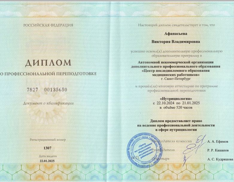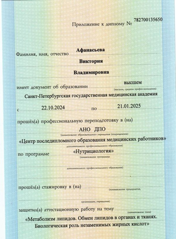 2024-2025гг. — АНО ДПО «Центр последипломного образования медицинских работников», Профессиональная переподготовка по специальности «Нутрициология»