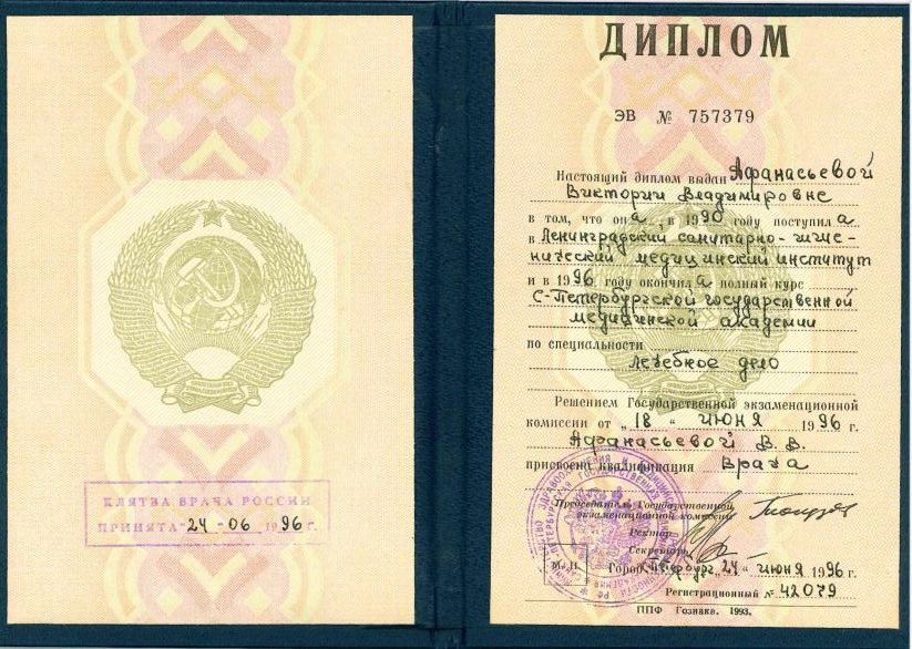 1996г. — Санкт-Петербургская медицинская академия им. Мечникова, специальность «Лечебное дело»