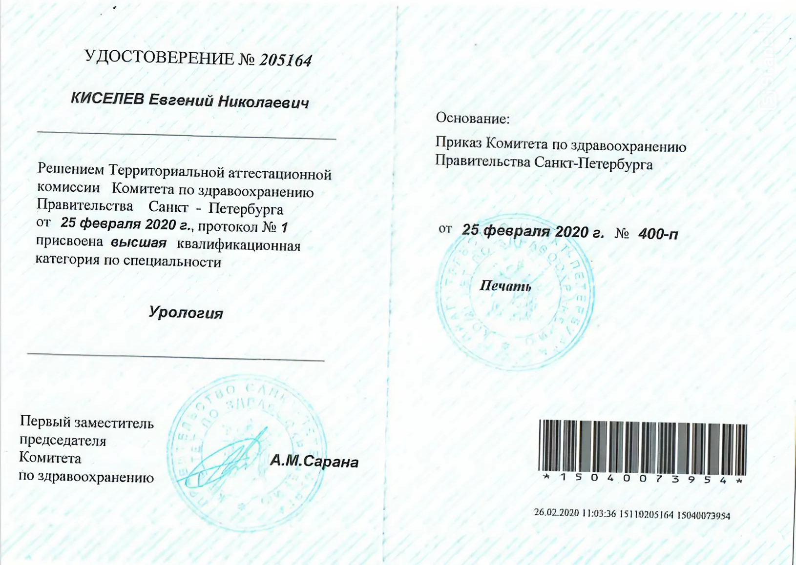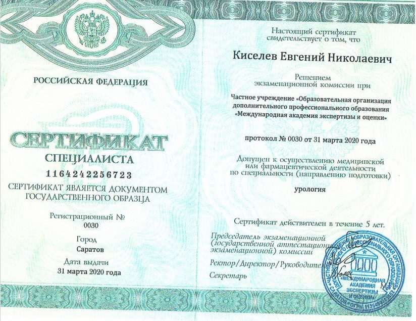 2015 г. повышение квалификации по специальности «Урология»